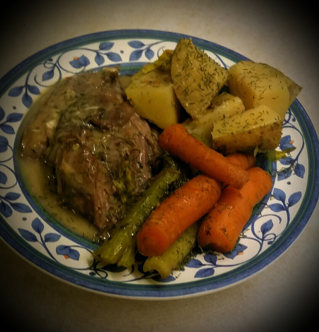 In morning before work, I took the bone from last night’s dinner and put it in a crock pot with potatoes, carrots, celery, garlic and onion. I then added salt, pepper, paprika, tumeric and Italian herbs (about half a tsp each) and filled the pot with water. I set the pot to Low and left for work.